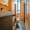 In bagno c’è una larga doccia a filo pavimento, lavabo e wc, lavabiancheria e stendino a soffitto.