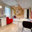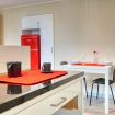 The living area consists of a comfortable double sofa bed, placed in front of a wall equipped with bookcase and smart TV, and Kartel design bookcase.