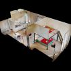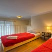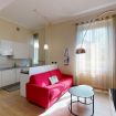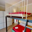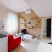 The living room leads to the master bedroom. The room is equipped with wardrobe with double sliding doors, chest of drawers, double bed, bedside tables and loft that houses two single beds for families who prefer to sleep together in the bedroom instead of using the sofa bed in the living room. The bathroom with window is accessed from the entrance. It’s a comfortable and functional bathroom, equipped with sink, toilet, bidet, shower cabin and towel warmer.